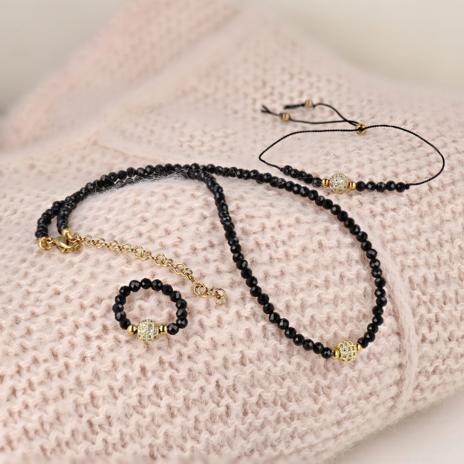Zestaw pierścionek, bransoletka, naszyjnik z kamieni: