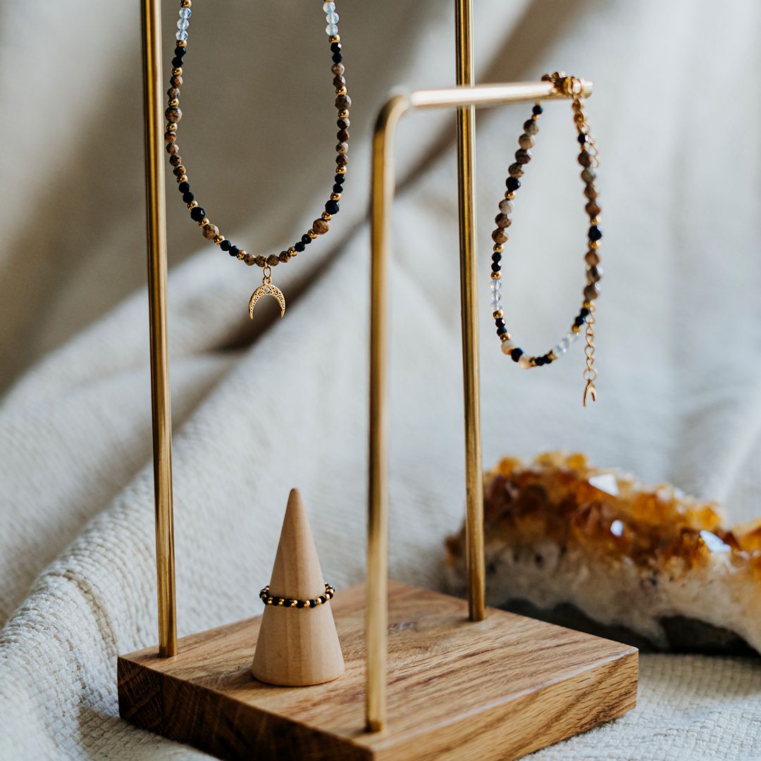 Nasze produkty tworzymy ręcznie z naturalnych kamieni: szlachetnych, półszlachetnych i mineralnych, a elementy wykończenia wykonane są z wysokiej jakości pozłacanej stali szlachetnej, która jest hipoalergiczna, odporna na ścieranie i zachowuje swój kolor w trakcie użytkowania.