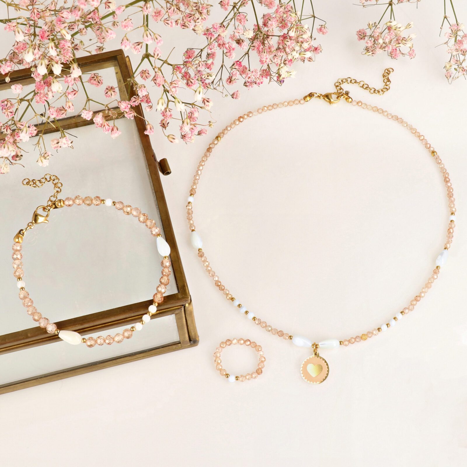 Nasze produkty tworzymy ręcznie z naturalnych kamieni: szlachetnych, półszlachetnych i mineralnych, a elementy wykończenia wykonane są z wysokiej jakości pozłacanej stali szlachetnej, która jest hipoalergiczna, odporna na ścieranie i zachowuje swój kolor w trakcie użytkowania.