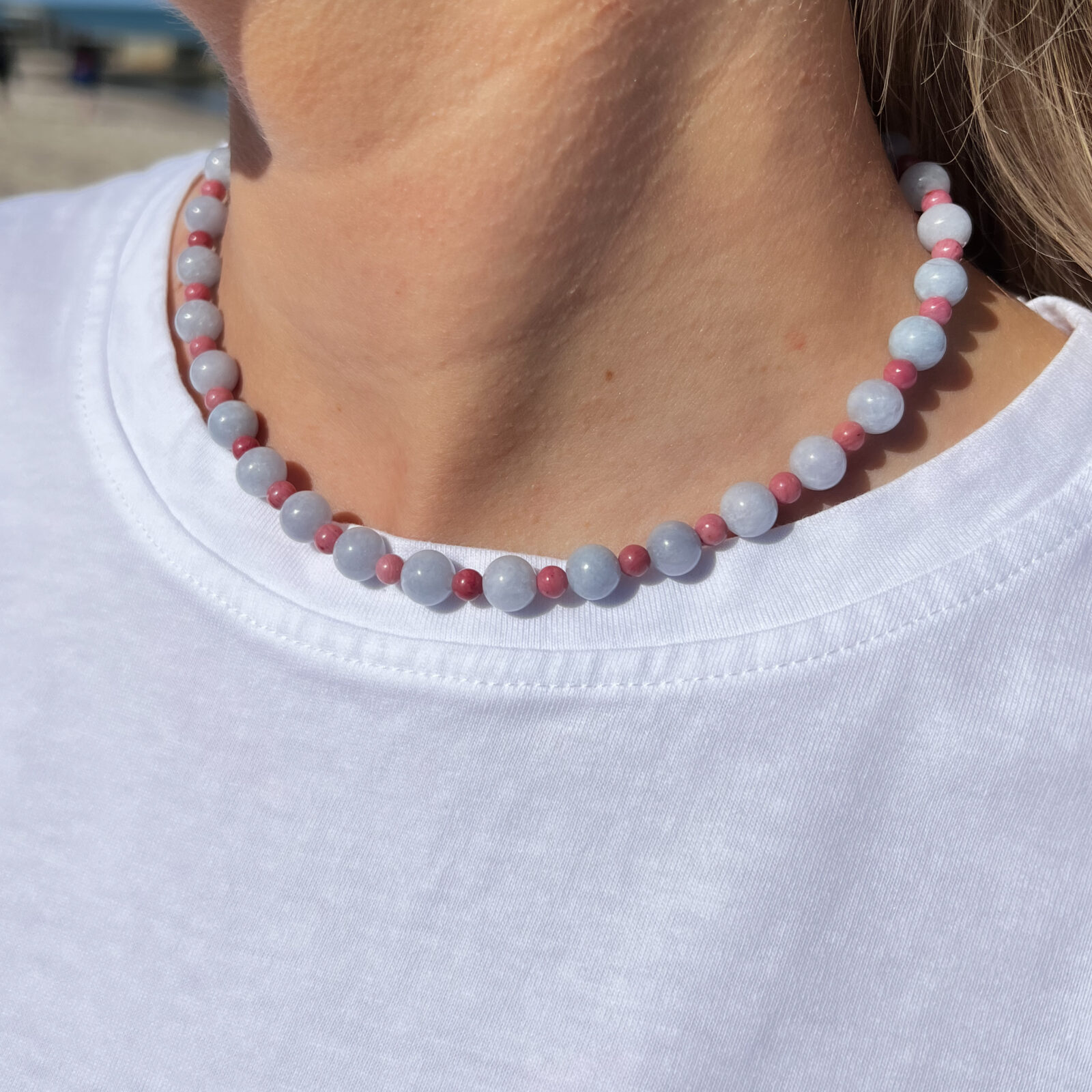 Przedstawiamy nasz naszyjnik z różowego jadeitu, połączonego z magnezytem – kamieniem delikatności i równowagi. Różowy jadeit to kamień miłości, przyjaźni i harmonii, który wspiera emocjonalne uzdrowienie, otwartość na miłość oraz poczucie bezpieczeństwa. Magnezyt, o swojej łagodnej, białej barwie, jest znany ze swoich właściwości uspokajających, pomagających w redukcji stresu i napięć, wprowadzając uczucie wewnętrznego spokoju. Ta wyjątkowa kombinacja kamieni tworzy naszyjnik, który promuje równowagę emocjonalną i wprowadza harmonię do codziennego życia. Idealny wybór dla osób szukających biżuterii pełnej subtelności, pozytywnej energii i naturalnego piękna.