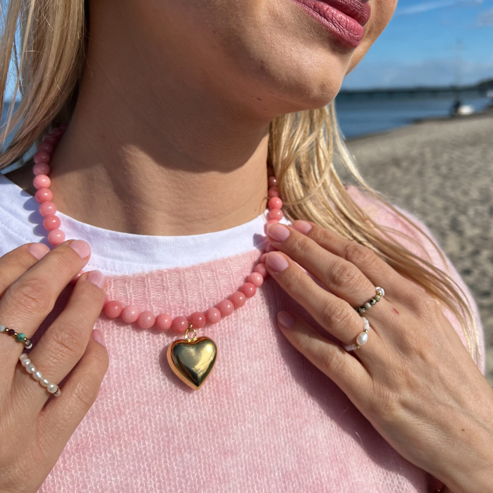 Przedstawiamy nasz choker z różowego Jadeitu, wykończony efektowną zawieszką w kształcie dużego serca. Ten naszyjnik emanuje ciepłem, delikatnością i kobiecą energią. Różowy Jadeit to kamień miłości, spokoju i emocjonalnego ukojenia – wspiera serce, sprzyja otwartości na uczucia i pomaga pielęgnować relacje, zarówno z innymi, jak i z samą sobą. Jego subtelna barwa dodaje romantyzmu każdej stylizacji, a wyraziste serce symbolizuje siłę uczuć i odwagi w ich wyrażaniu. To biżuteria stworzona dla osób, które chcą nosić przy sobie przypomnienie o miłości, bliskości i sile kobiecej wrażliwości.