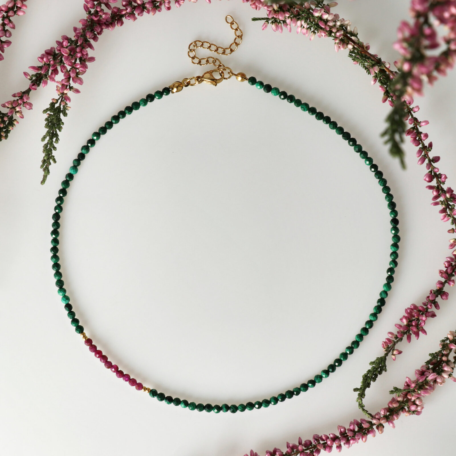 Poznaj nasz klasyczny naszyjnik, wykonany z kamieni Malachitu oraz Rubinu, które razem tworzą unikalną, energetyczną kompozycję. Połączenie tych kamieni harmonizuje energię, wspierając rozwój osobisty oraz ochronę przed negatywnymi wpływami zewnętrznymi. Naszyjnik ma formę delikatnego, subtelnego chokera z możliwością regulacji długości, dzięki czemu łatwo dopasować go do indywidualnych preferencji. To idealny wybór dla osób ceniących zarówno piękno, jak i głębokie znaczenie kryształów.