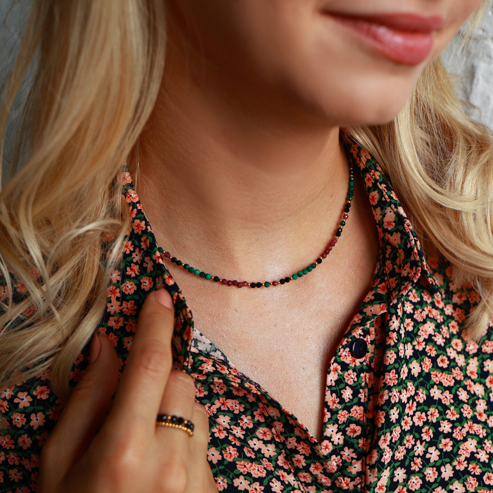 Poznaj nasz klasyczny choker o unikatowych barwach zieleni, bordo i czerni, wykonany z kamieni Malachitu, Rubinu oraz Czarnego Turmalinu. To naszyjnik, który idealnie pasuje do wielu stylizacji, dodając im elegancji i wyrazistości. Połączenie tych trzech kamieni tworzy wyjątkową energetykę, która sprzyja ochronie, transformacji oraz dodaje siły do pokonywania codziennych wyzwań. To idealny choker dla osób poszukujących biżuterii, która nie tylko zachwyca wyglądem, ale także wzmacnia wewnętrzną równowagę i pozytywnie wpływa na energię.