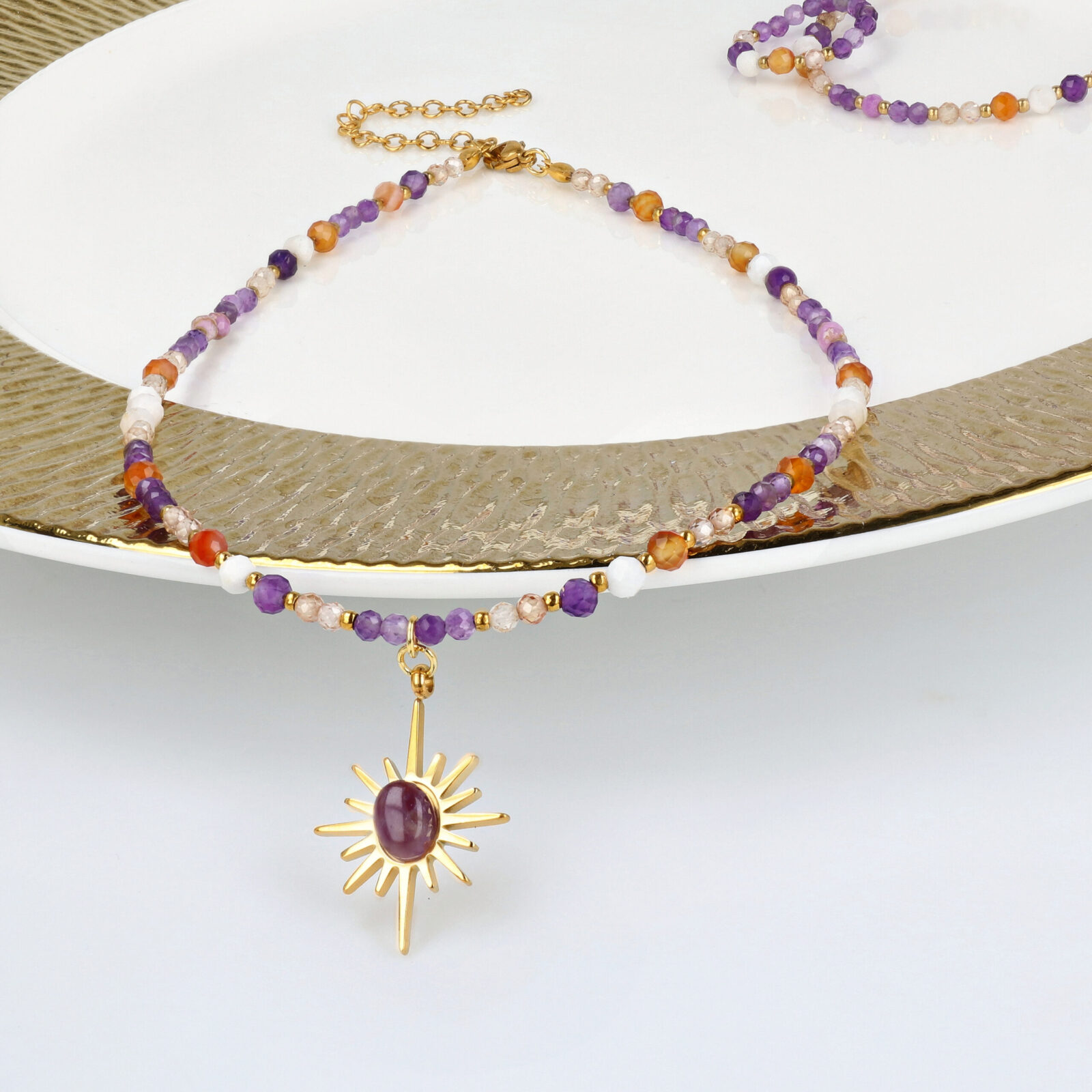Naszyjnik Choker z Ametystem, Agatem pomarańczowym, Kamieniem księżycowym, Cyrkonią szampańską