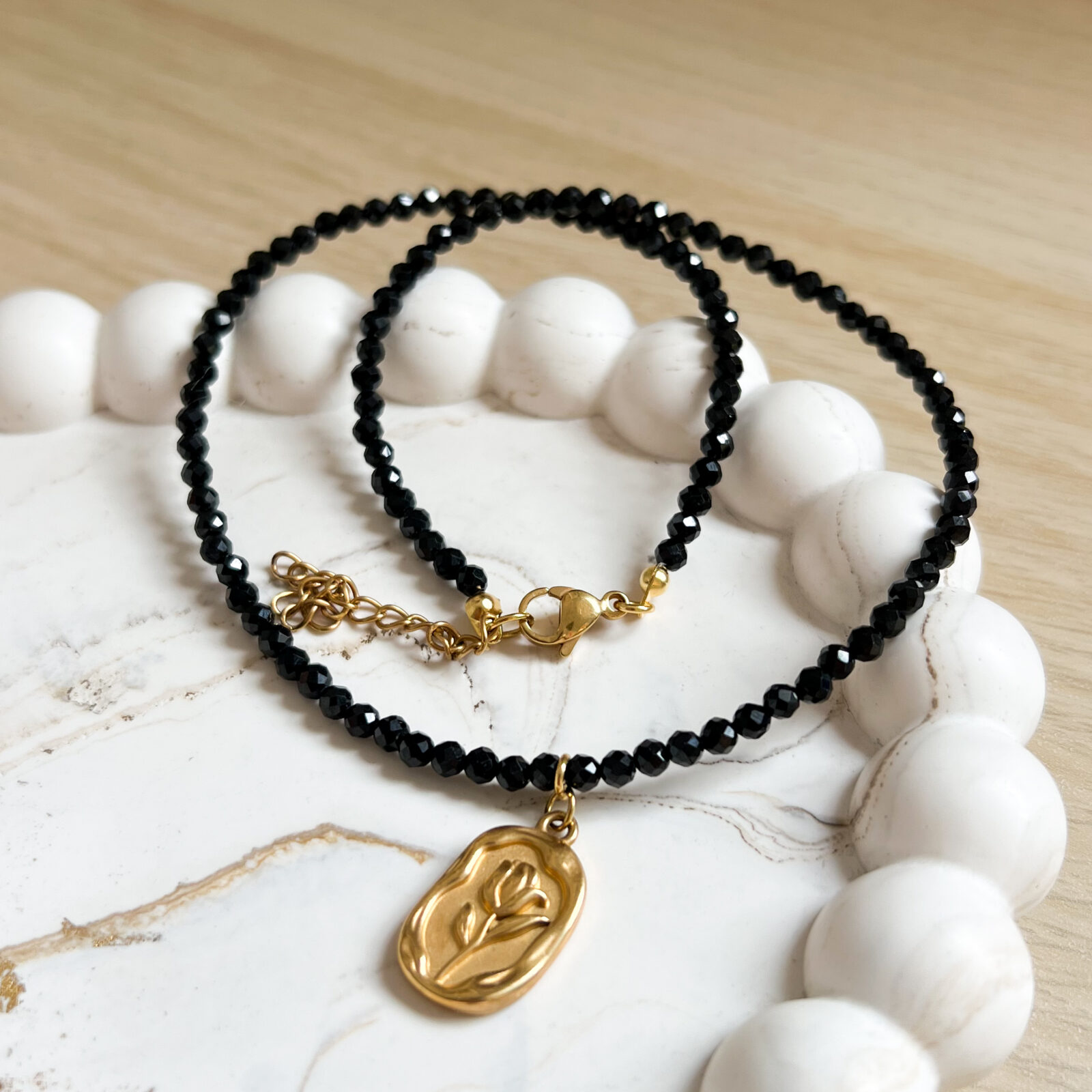 Czarny choker z drobnych kamyków turmalinu to minimalistyczna biżuteria z wyrazistym charakterem. Delikatne, głębokie czarne kamienie, które układają się blisko szyi, dodają elegancji, a jednocześnie niosą ze sobą moc ochrony i uziemienia. Ten choker idealnie komponuje się z każdą stylizacją – od codziennych po wieczorowe, podkreślając indywidualny styl i pozytywną energię naturalnego turmalinu.