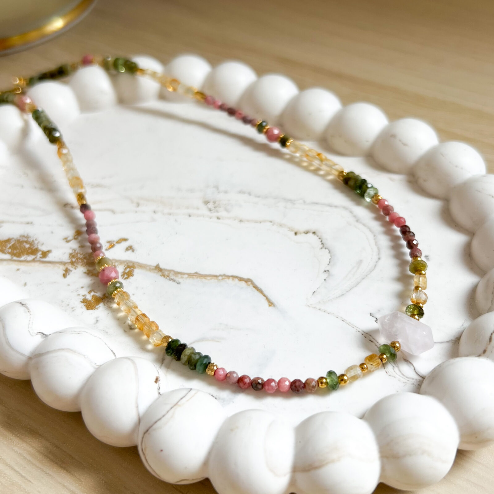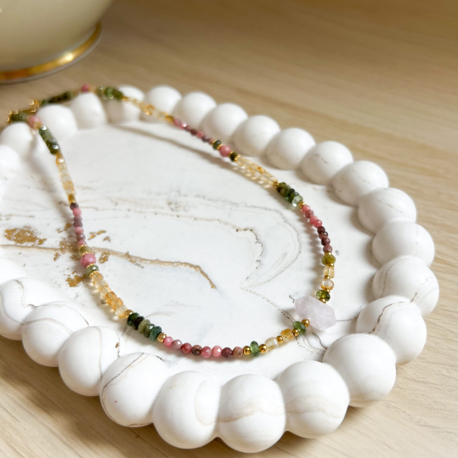Natura i symbolika spotykają się w naszym wyjątkowym chokerze, stworzonym z myślą o duszach poszukujących głębi i piękna. Kompozycja rodonitu, zielonego turmalinu, cytrynu i thulitu zachwyca subtelną grą barw – od pudrowych różów, przez świeżą zieleń, po ciepłe, słoneczne tony. Centralnym punktem naszyjnika jest grot z kwarcu różowego – kamienia bezwarunkowej miłości i łagodności, który przyciąga serce do serca.