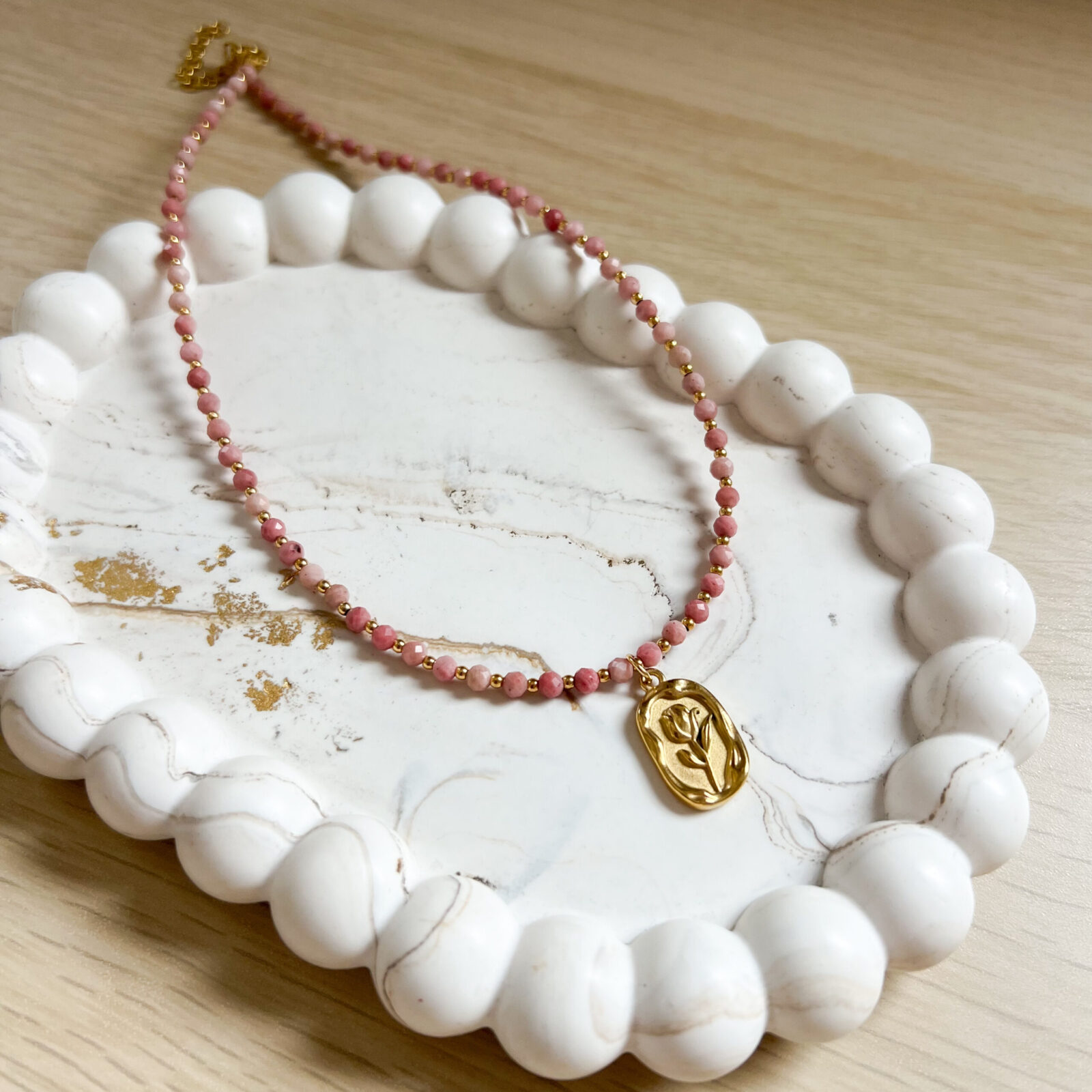 Nasze produkty tworzymy ręcznie z naturalnych kamieni: szlachetnych, półszlachetnych i mineralnych, a elementy wykończenia wykonane są z wysokiej jakości pozłacanej stali szlachetnej, która jest hipoalergiczna, odporna na ścieranie i zachowuje swój kolor w trakcie użytkowania.