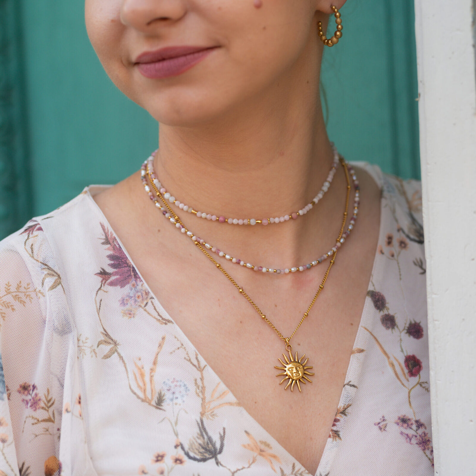 Nasze produkty tworzymy ręcznie z naturalnych kamieni: szlachetnych, półszlachetnych i mineralnych, a elementy wykończenia wykonane są z wysokiej jakości pozłacanej stali szlachetnej, która jest hipoalergiczna, odporna na ścieranie i zachowuje swój kolor w trakcie użytkowania.