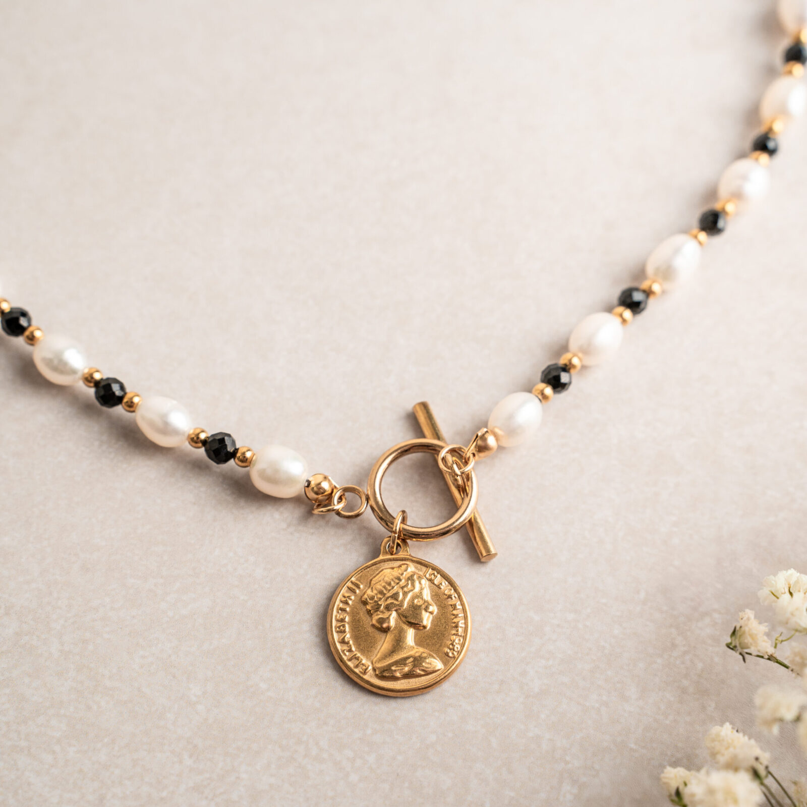 Poznaj nasz elegancki naszyjnik z Perłą i Czarnym Turmalinem, gdzie klasyka spotyka się z surową energią natury. Naprzemienne ułożenie kamieni tworzy harmonijną kompozycję. Całość dopełnia stylowe zapięcie typu toggle oraz zawieszka w formie monety, która nadaje biżuterii unikalnego charakteru. Zawieszka jest dwustronna, co prezentują załączone zdjęcia, ukazujące jej wyjątkowe detale.