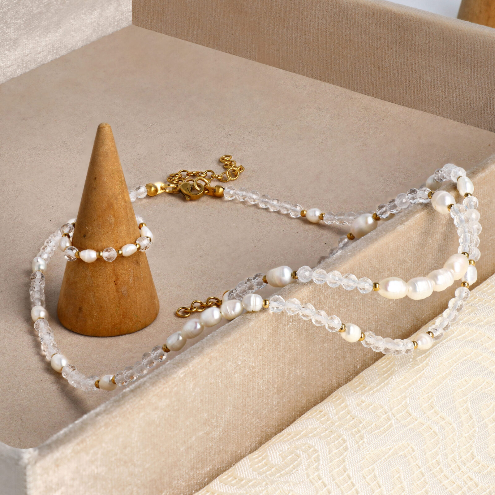 Zestaw składający się z naszyjnika, pierścionka i bransoletki, wykonany z perły naturalnej oraz kryształu górskiego, łączy w sobie łagodność i harmonię perły z oczyszczającą, wzmacniającą mocą kryształu – tworząc talizman spokoju, jasności myśli i wewnętrznej siły