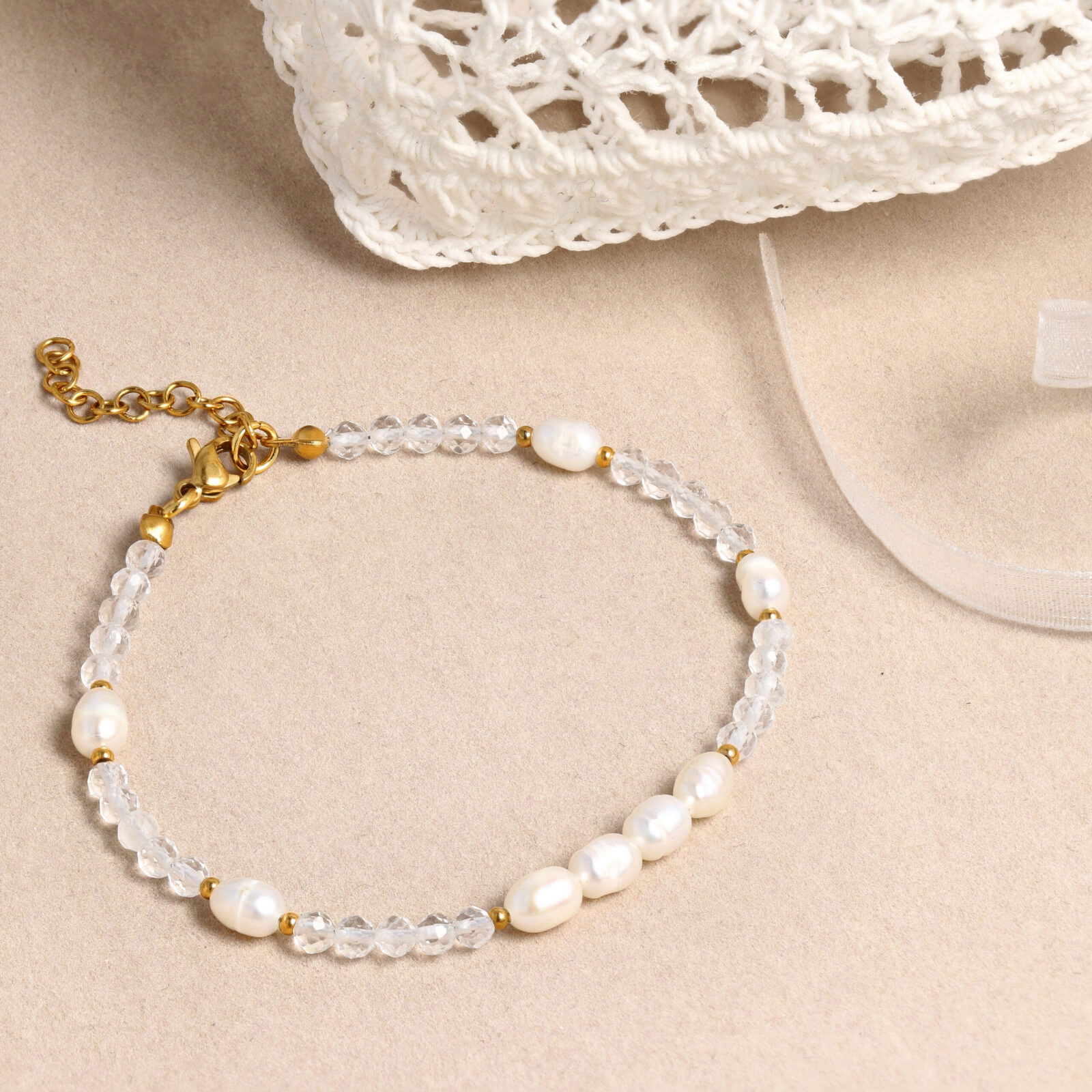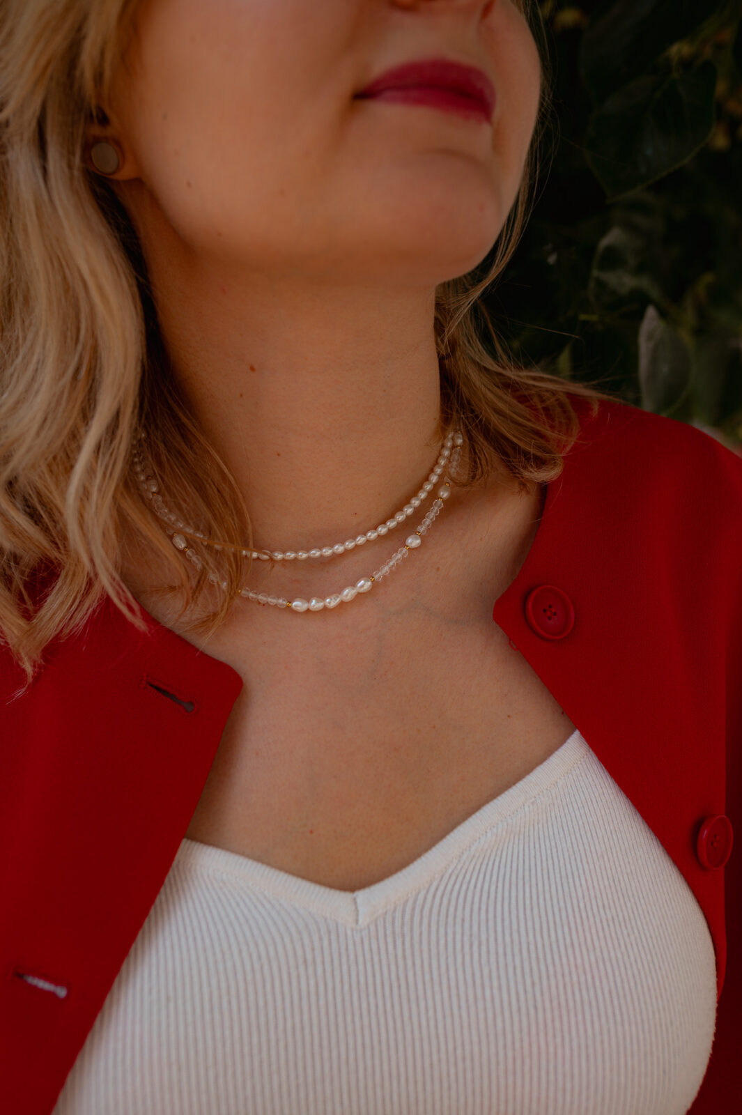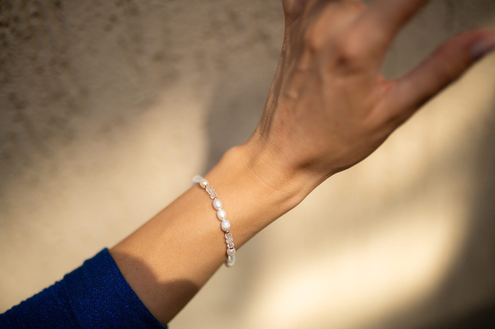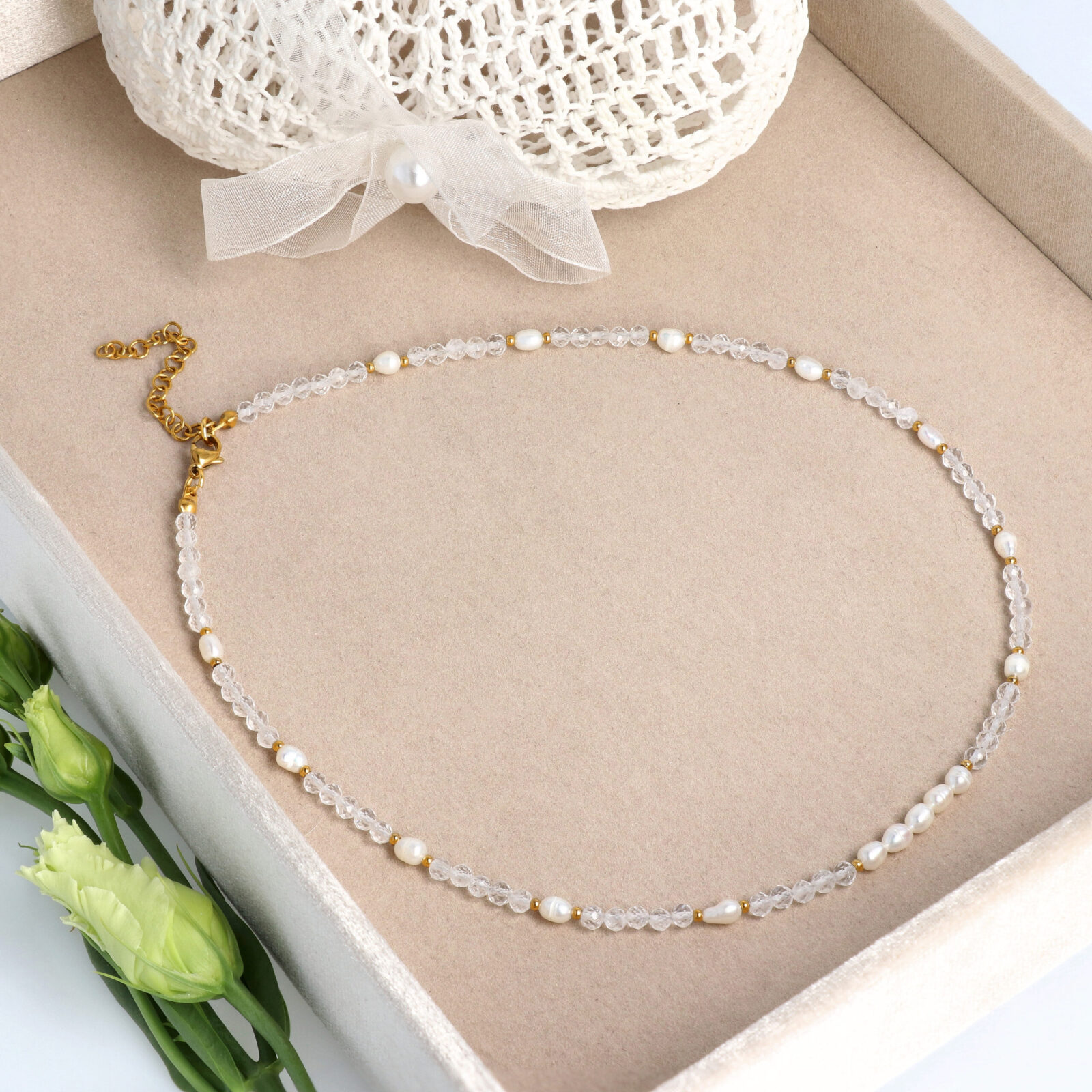 Zestaw składający się z naszyjnika, pierścionka i bransoletki, wykonany z perły naturalnej oraz kryształu górskiego, łączy w sobie łagodność i harmonię perły z oczyszczającą, wzmacniającą mocą kryształu – tworząc talizman spokoju, jasności myśli i wewnętrznej siły
