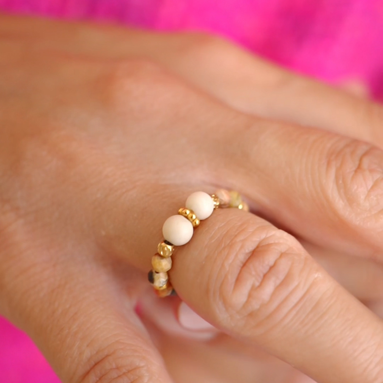 Poznaj nasz elegancki pierścionek, wykonany z Jaspisu Obrazkowego oraz Kamienia Rzecznego, który zachwyca klasycznymi beżowymi odcieniami. Pierścionek ozdobiony jest unikatowymi przekładkami o różnych kształtach, które nadają mu wyjątkowego charakteru. Wykonany na elastycznej gumce, pierścionek z łatwością dopasowuje się do palca, zapewniając komfort noszenia na co dzień.