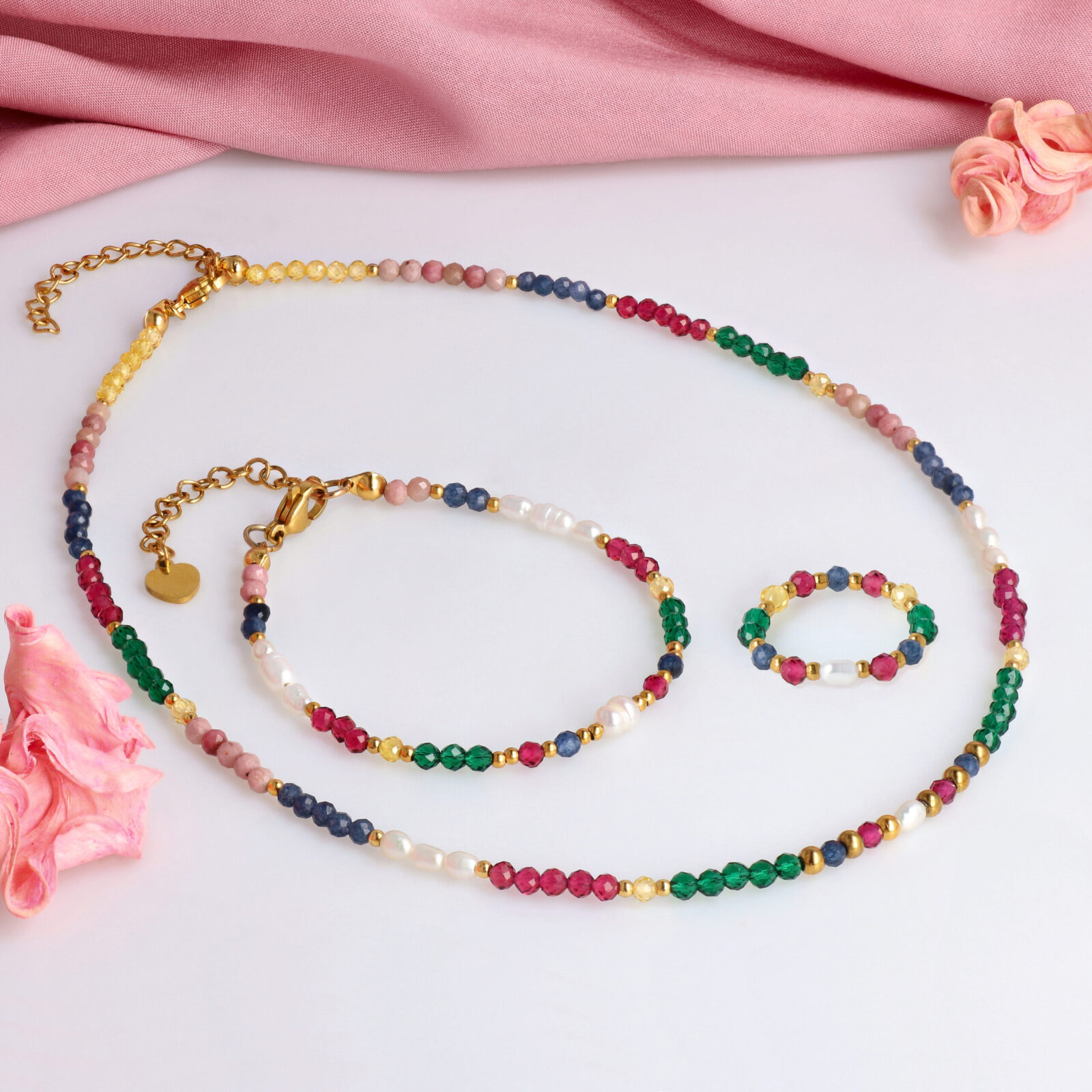 Zestaw składający się z naszyjnika, bransoletki i pierścionka.