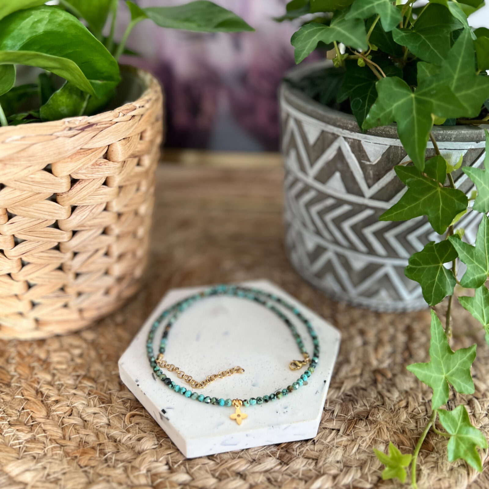 Turkus afrykański – turkus to kamień szlachetny, należący do grupy rzadkich minerałów. Kamień zwany ” zwycięzcą”. We wszystkich epokach, przez wojowników był uważany za pełen energii talizman. Wzmaga chęć samorealizacji, pomaga rozwinąć naturalne zdolności i silne strony. Przynosi mądrość, dzięki czemu inspiruje do rozwiązywania problemów. Turkus jest kamieniem podróżników, chroni przed wypadkami podróżujących i ich majątek. Przyniesie możliwość ogromnego rozwoju i wzmocnienia cech przywódczych. Łagodzi stany depresyjne, zapewnia równowagę na poziomie fizycznym. Działa wzmacniająco na serce, gardło i płuca jak również cały układ oddechowy. Jest pomocny przy leczeniu infekcji wirusowych i problemów żołądkowych.