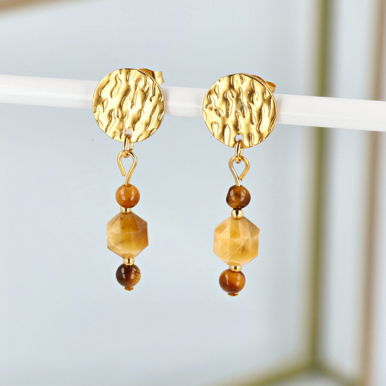 Nasze produkty tworzymy ręcznie z naturalnych kamieni: szlachetnych, półszlachetnych i mineralnych, a elementy wykończenia wykonane są z wysokiej jakości pozłacanej stali szlachetnej, która jest hipoalergiczna, odporna na ścieranie i zachowuje swój kolor w trakcie użytkowania.