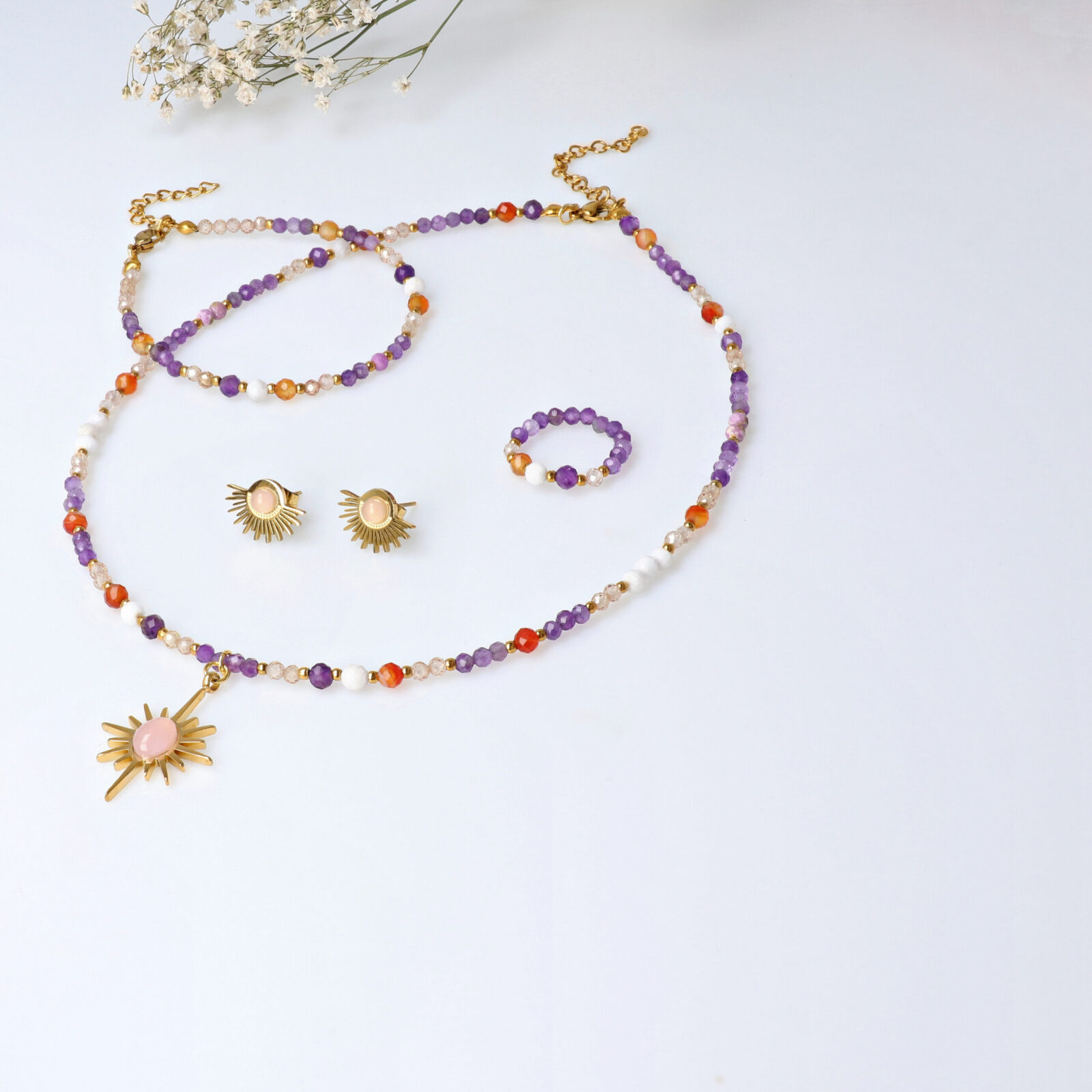 Nasze produkty tworzymy ręcznie z naturalnych kamieni: szlachetnych, półszlachetnych i mineralnych, a elementy wykończenia wykonane są z wysokiej jakości pozłacanej stali szlachetnej, która jest hipoalergiczna, odporna na ścieranie i zachowuje swój kolor w trakcie użytkowania.