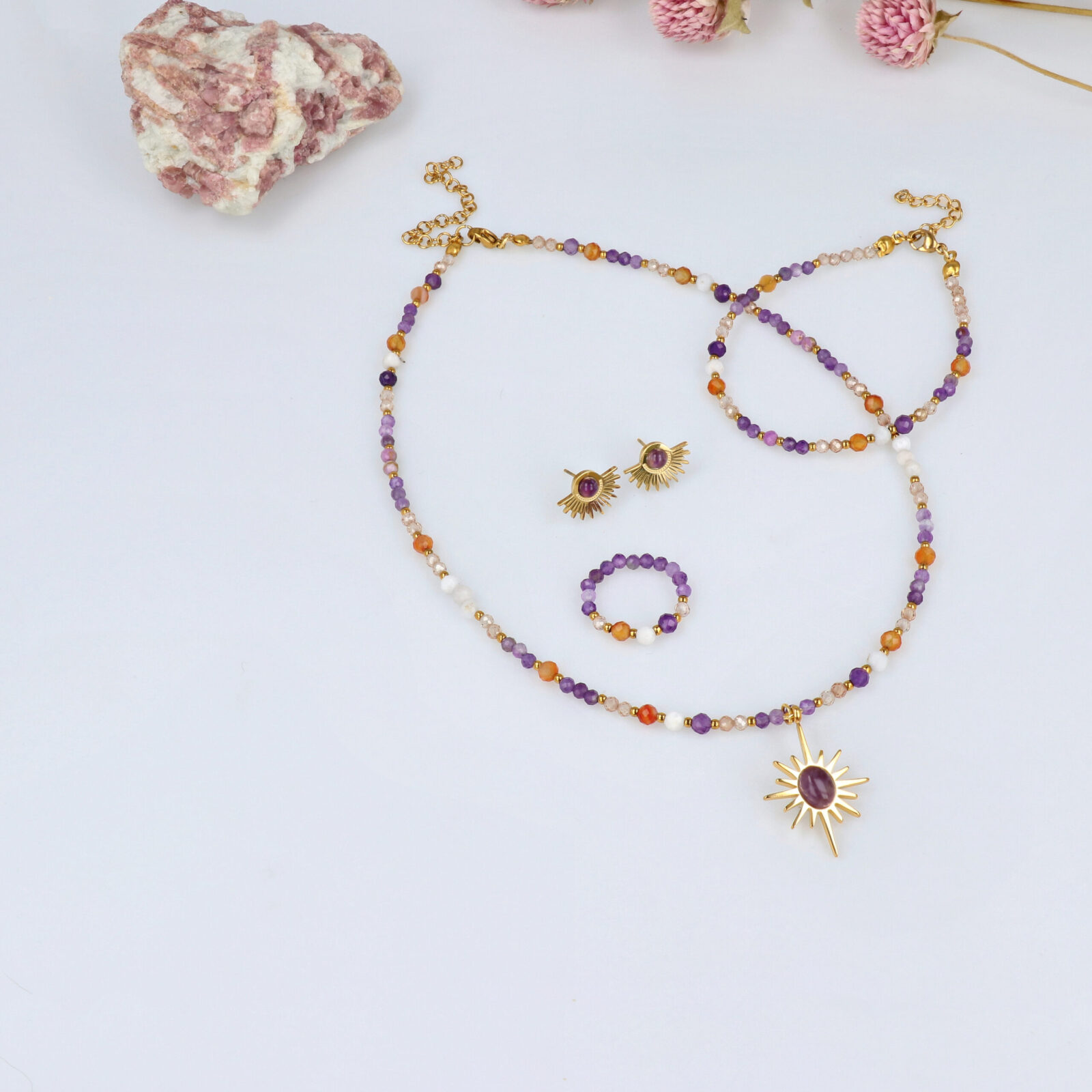Zestaw Ametyst, Agat pomarańczowy, Kamień księżycowy, Cyrkonia szampańska, Kamień słoneczny