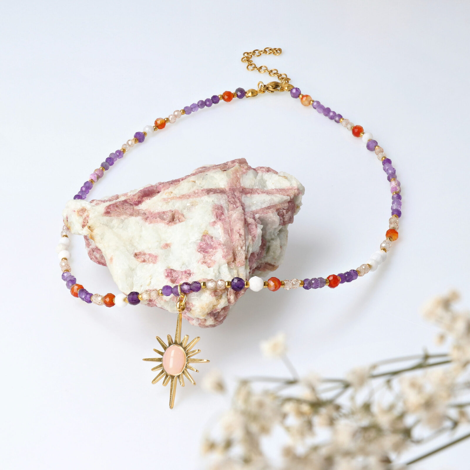 Nasze produkty tworzymy ręcznie z naturalnych kamieni: szlachetnych, półszlachetnych i mineralnych, a elementy wykończenia wykonane są z wysokiej jakości pozłacanej stali szlachetnej, która jest hipoalergiczna, odporna na ścieranie i zachowuje swój kolor w trakcie użytkowania.